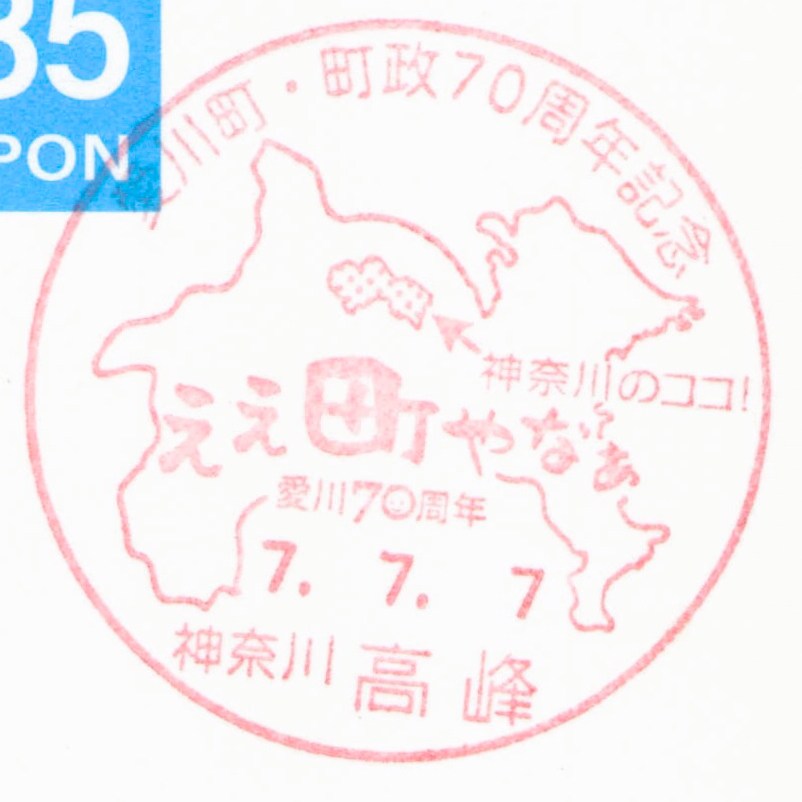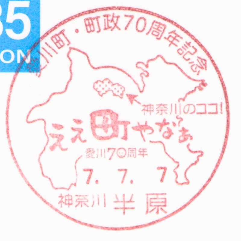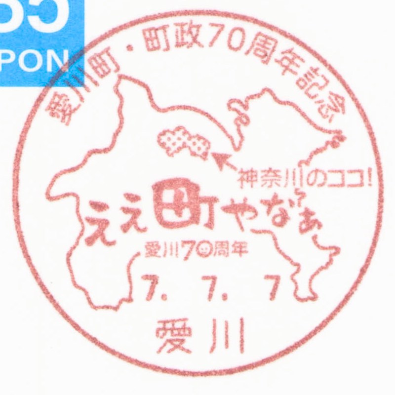 【小型印】愛川町・町政70周年 2025年7月10日 通信日附印 X Bluesky Facebook Hatena Bookmark LINE 神奈川県愛甲郡愛川町の郵便局5局において、愛川町・町政70周年を記念した小型印が7月1日より使用開始されています。 奇しくも今年は令和7年ということで、7並びの日となる7年7月7日に町内5局で小型印を押印してもらいました。 図案は神奈川県の地図に愛川町の位置を示したものに、町政70周年のキャッチフレーズロゴがあしらわれています。なお、5局すべて同じ図案です。 愛川郵便局 半原郵便局 中津郵便局 高峰郵便局 愛川田代郵便局