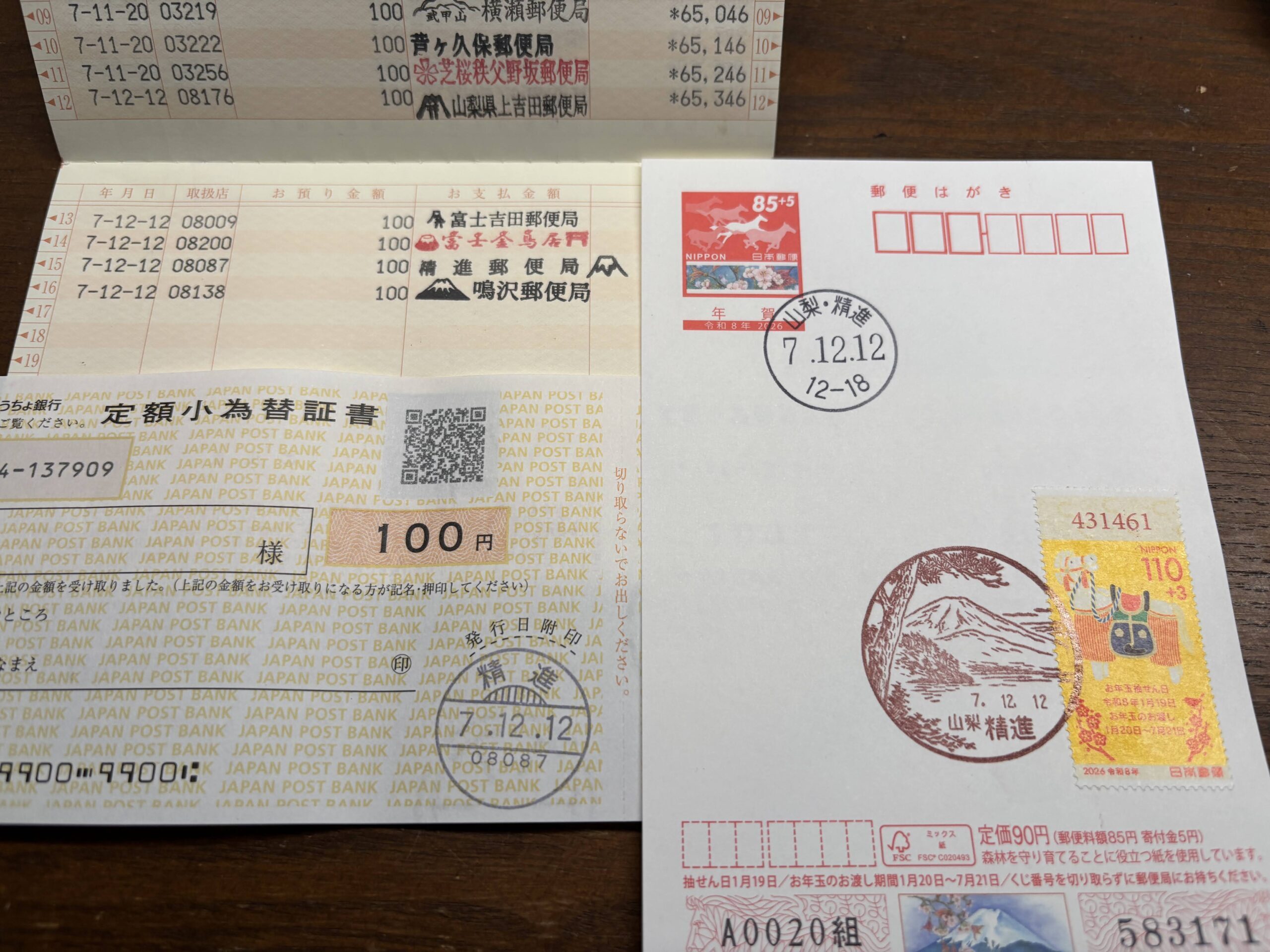 貯金して小為替を購入。今年の山梨版年賀はがきに和文印と押印してもらいます。