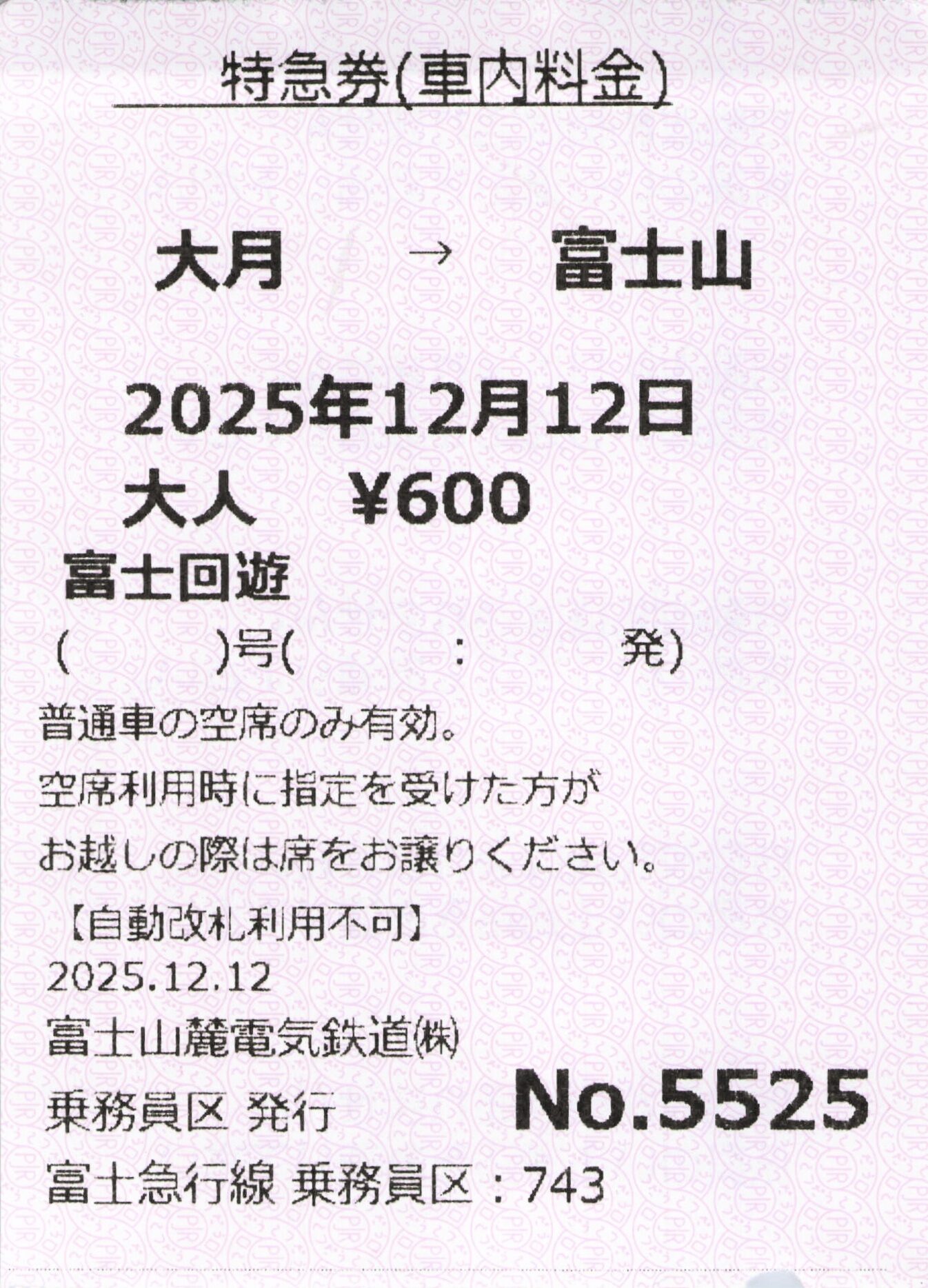 この満席の中でも車掌が車内改札にきます。大月までの特急券しか持っていないので、車掌から特急券を購入。都留文科大学前で空席が出たので着席できました。