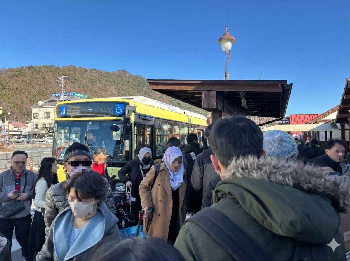 河口湖に到着して改札を出るとすぐ目の前にバス乗り場があります。正直、鳴沢や本栖湖方面のバスなんざ誰も乗らずに空気を運んでるもんだと思っていたのですが、乗り場にはそれなりの長い列ができています。