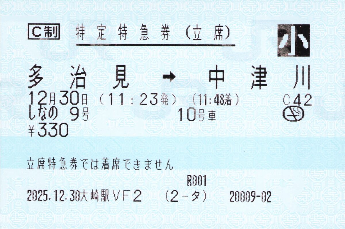大崎駅VF2発行、多治見から中津川まで「しなの9号」の立席特急券です。