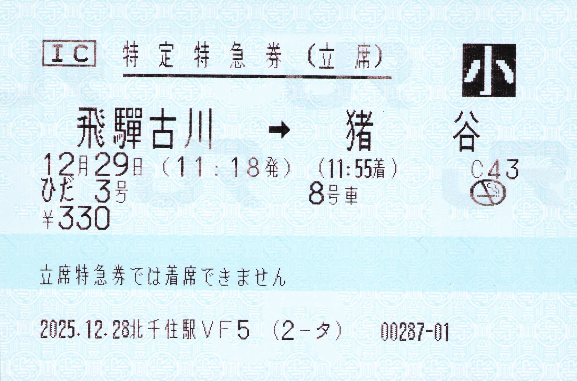 北千住駅VF5発行、飛騨古川から猪谷まで「ひだ3号」の立席特急券です。