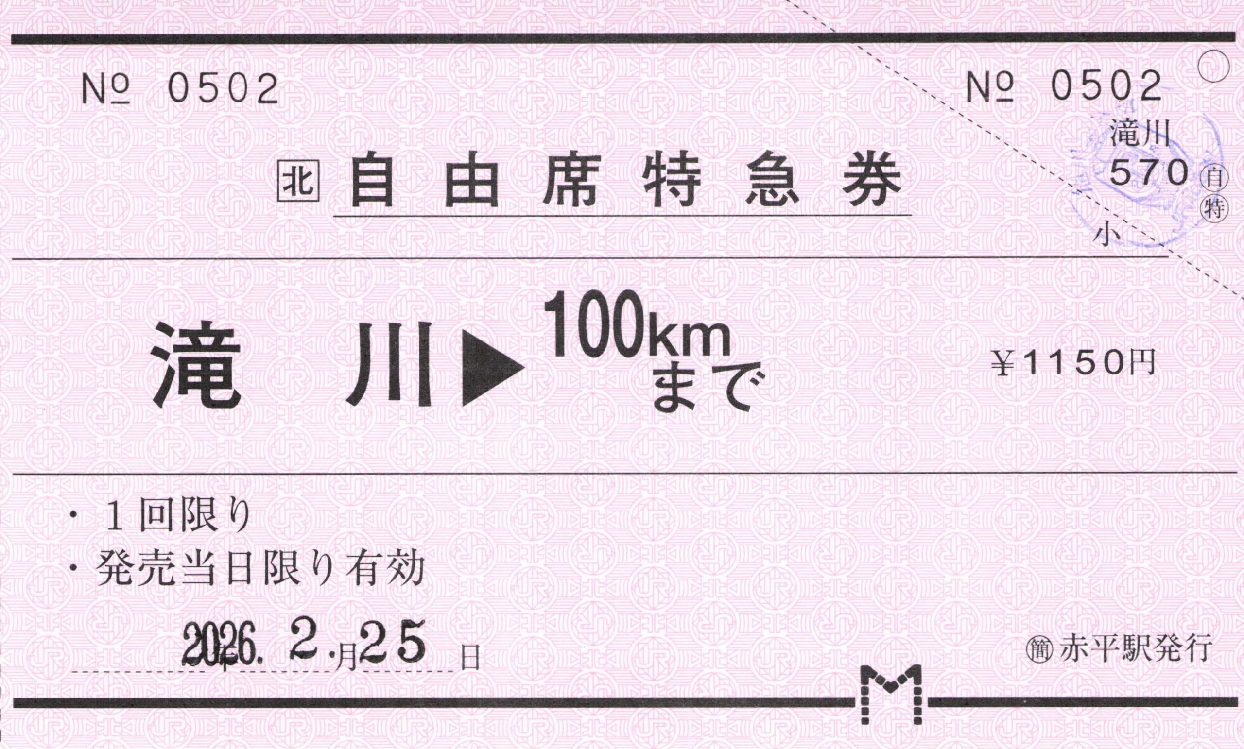 赤平駅発行、滝川から100kmまでの自由席特急券です。