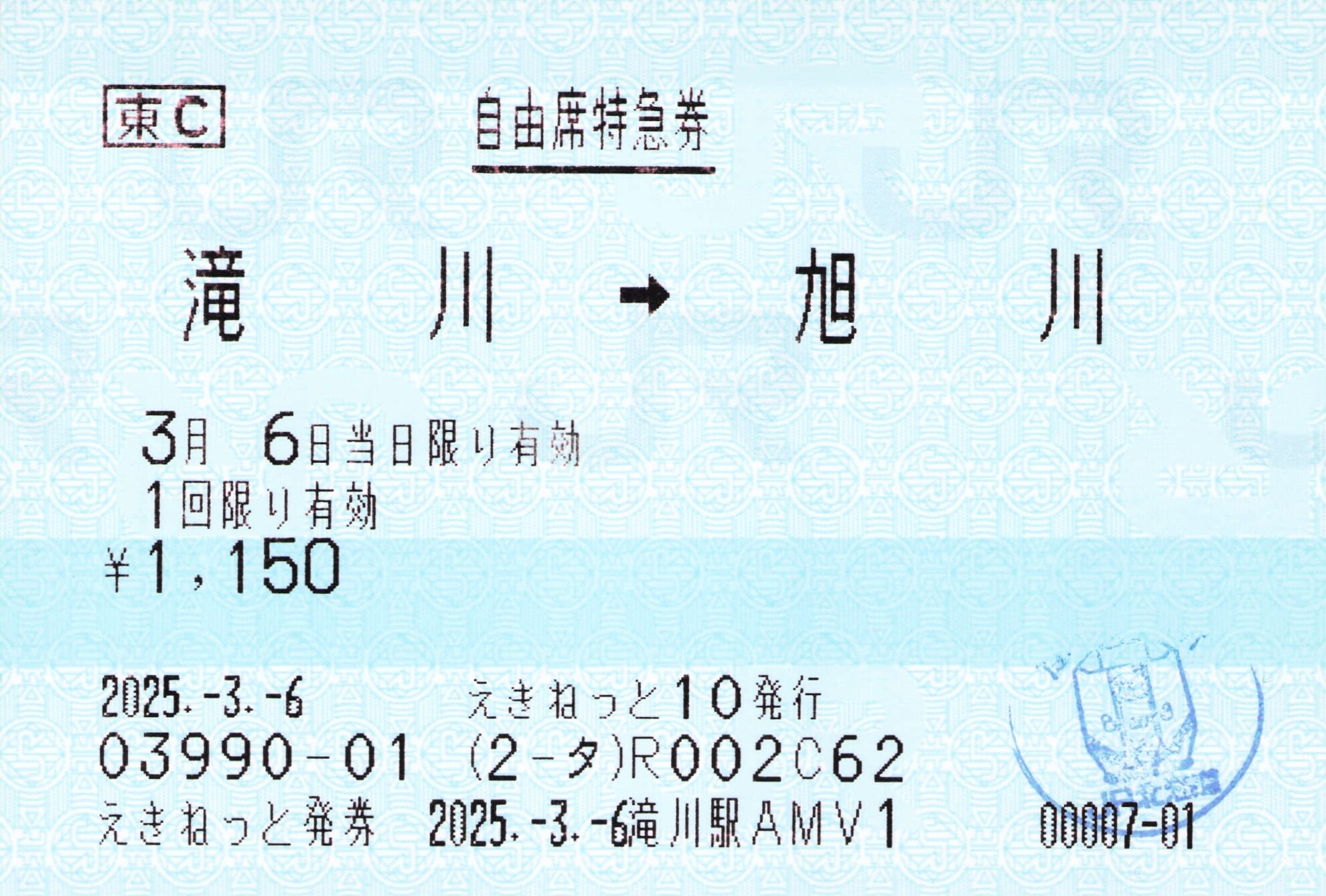 えきねっと10発行、滝川駅AMV1発券、滝川から旭川までの自由席特急券です。