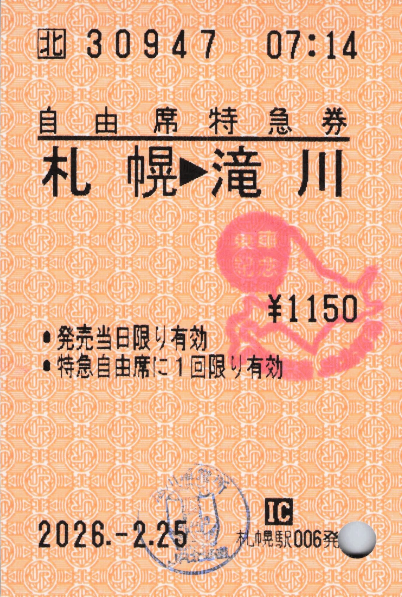 札幌駅006発行、札幌から滝川までの自由席特急券です。