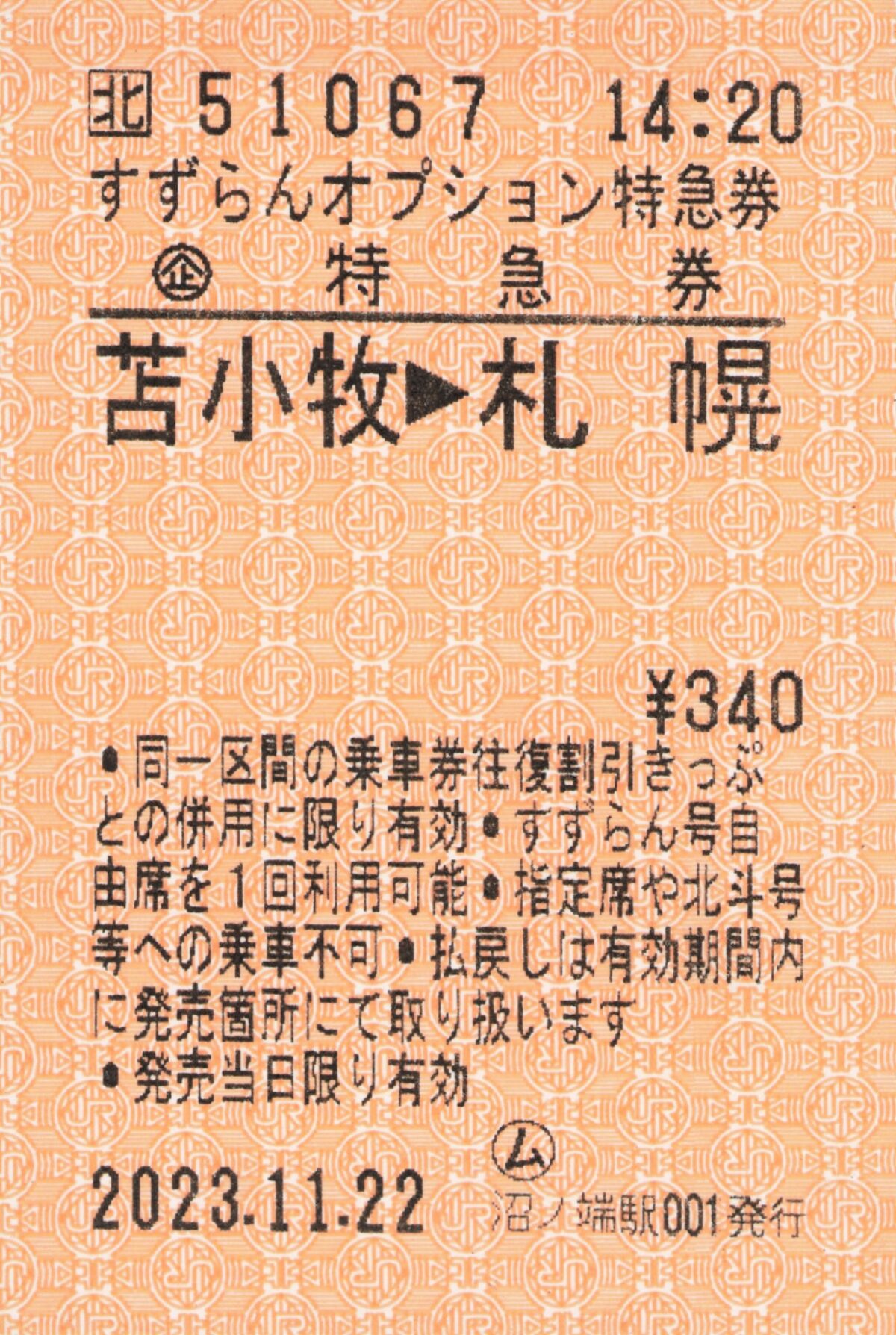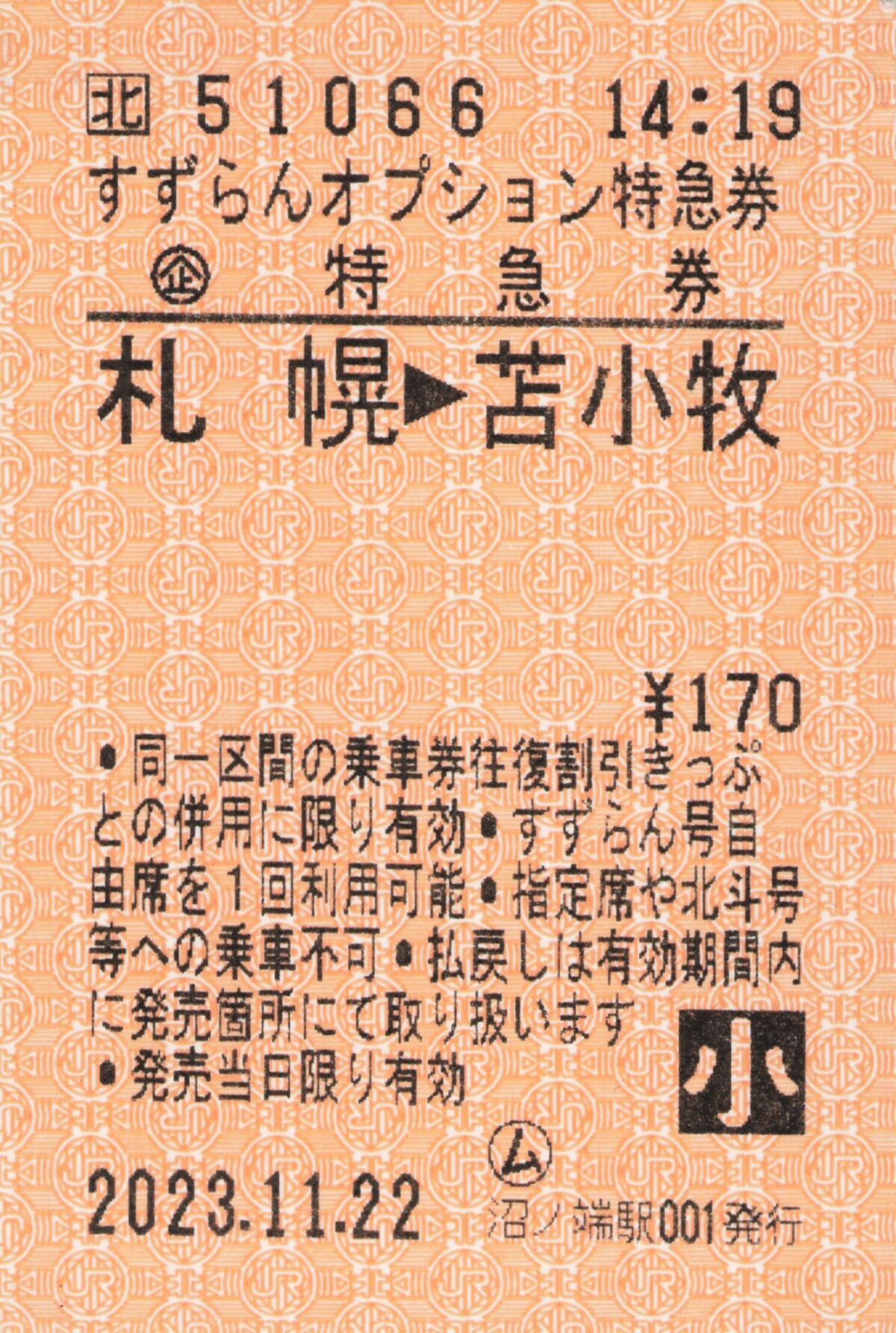 沼ノ端駅001発行、苫小牧から札幌までのすずらんオプション特急券です。