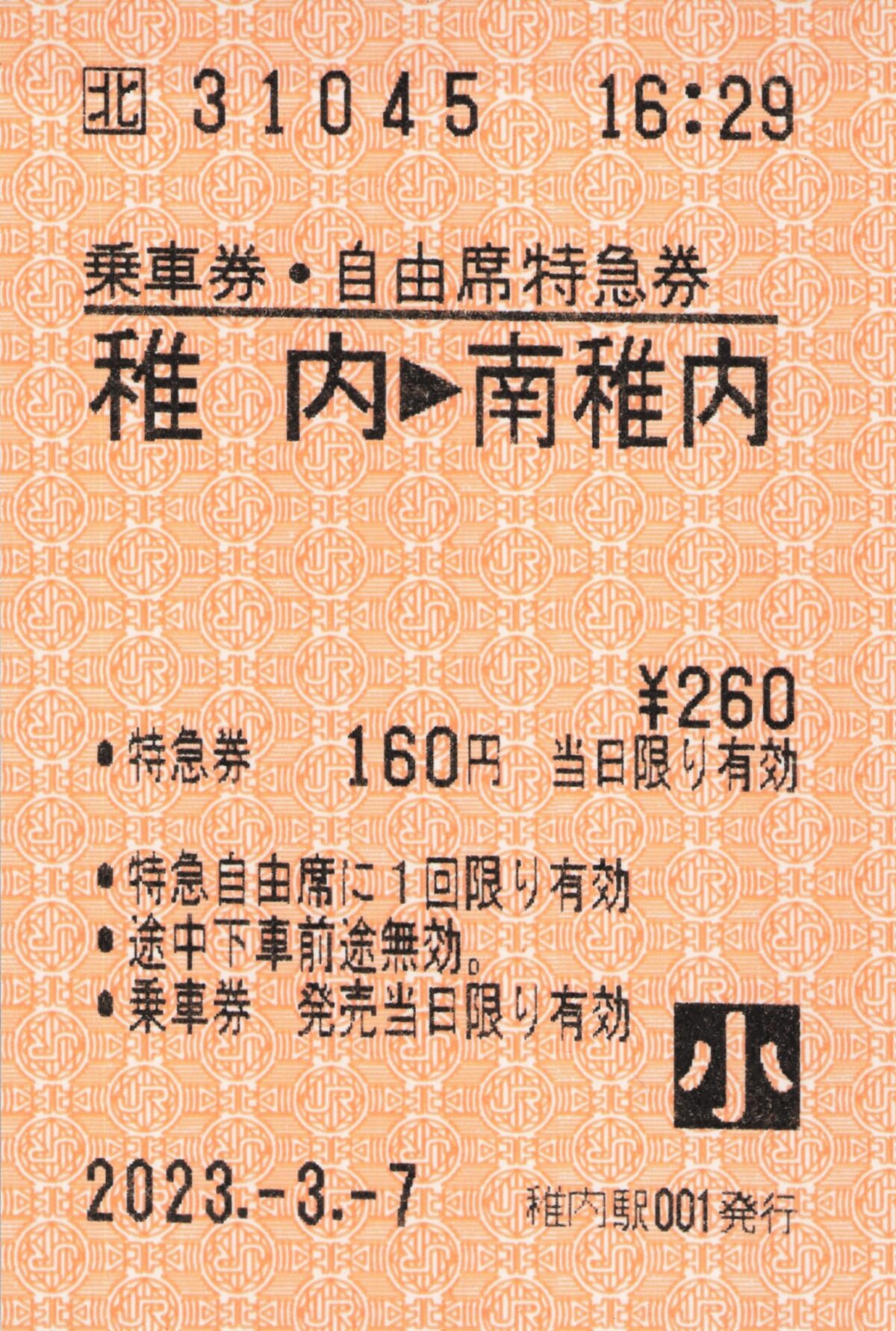 稚内駅001発行、稚内から南稚内までの乗車券・自由席特急券です。