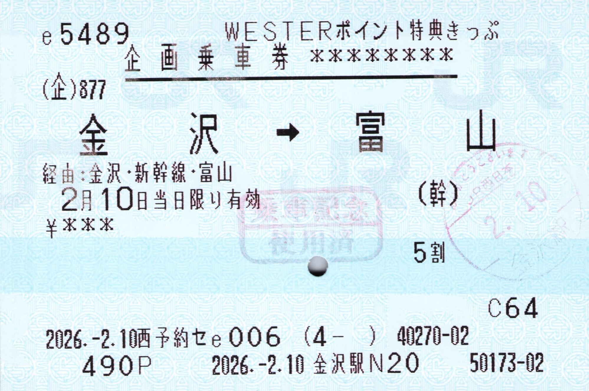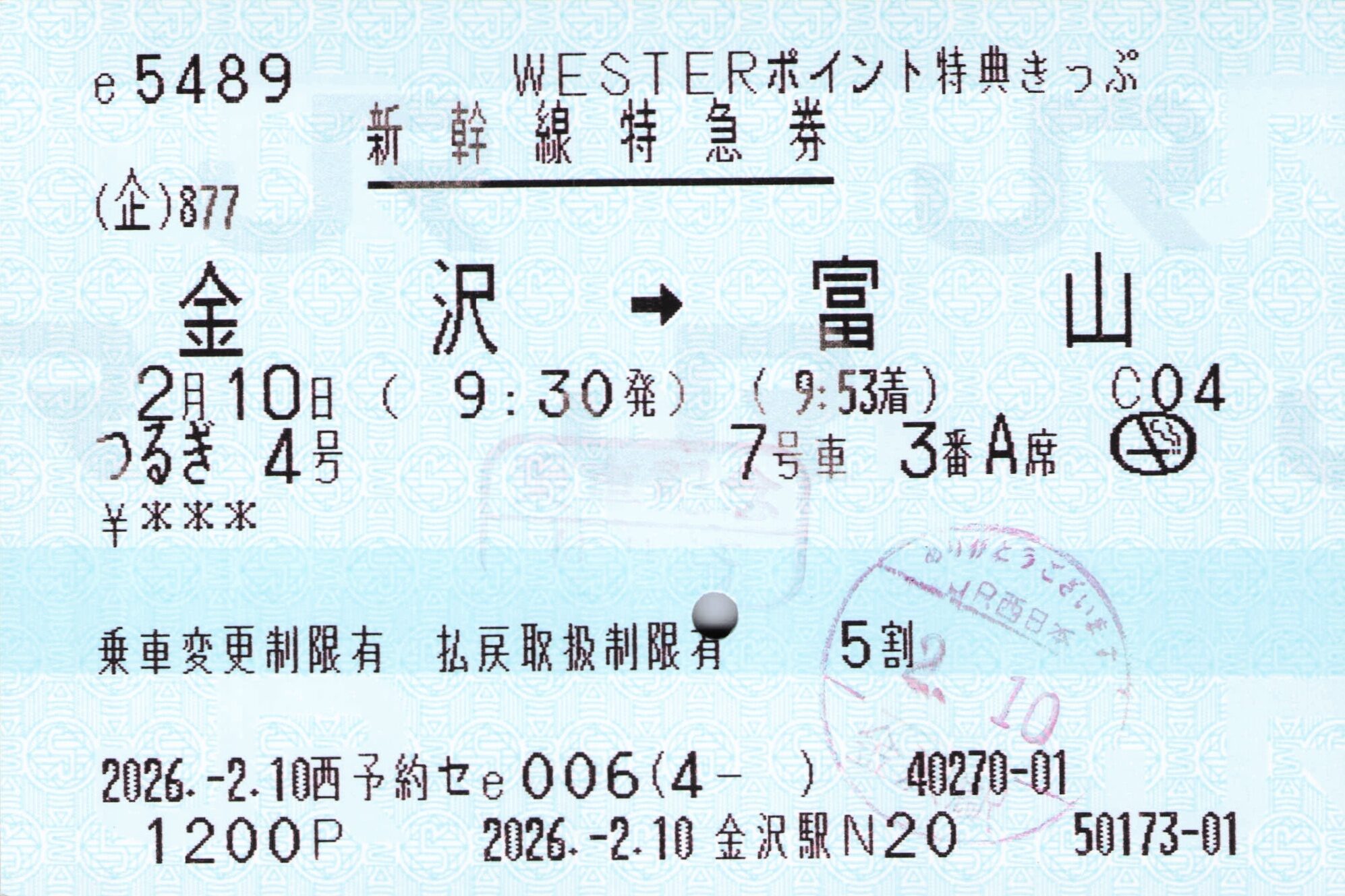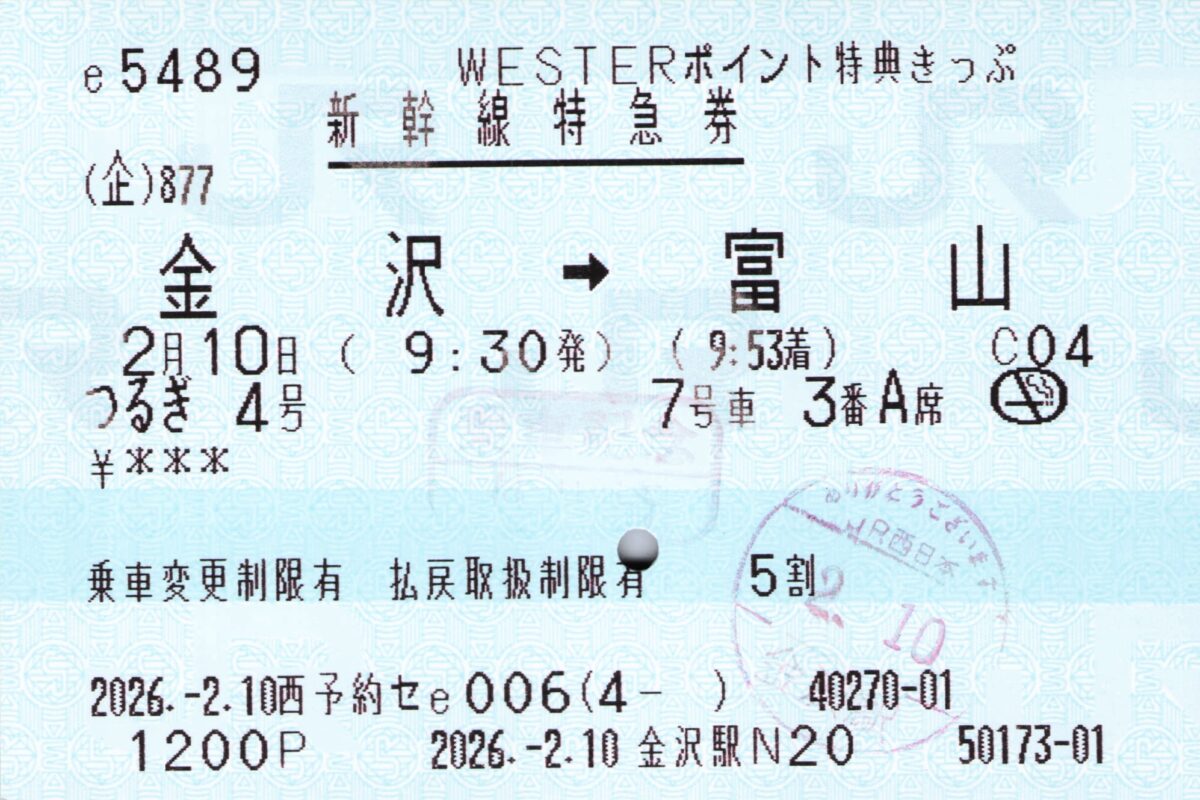 西予約セe006発行、金沢駅N20発券、金沢から富山までのWESTERポイント特典きっぷです。