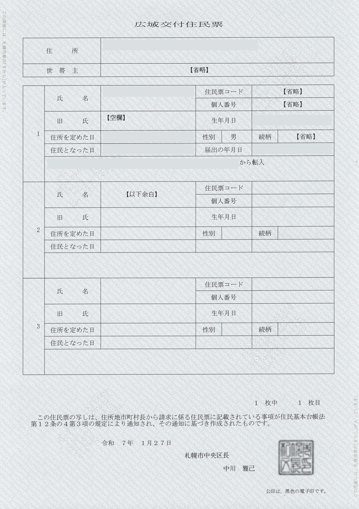 北海道 札幌市中央区 交付日 2025年1月27日 交付者 札幌市中央区長 交付箇所 大通証明サービスコーナー 用紙 改ざん防止用紙 公印 電子公印 交付手数料 350円 キャッシュレス対応 対応 キャッシュレスURL リンク 公印の特徴 書体:篆書 文字配列:横書き2段 改ざん防止用紙の特徴 灰色背景に白字で「SAPPORO」の地紋