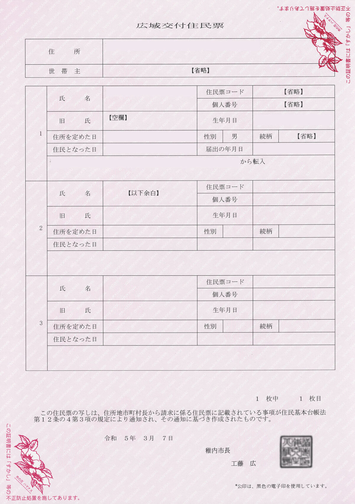 北海道 稚内市 交付日 2023年3月7日 交付者 稚内市長 交付箇所 稚内市役所 用紙 改ざん防止用紙 公印 電子公印 交付手数料 300円 公印の特徴 書体:篆書 文字配列:横書き3段 改ざん防止用紙の特徴 薄赤色の背景に「WAKKANAI」の文字 右上と左下に「市の花 ハマナス」