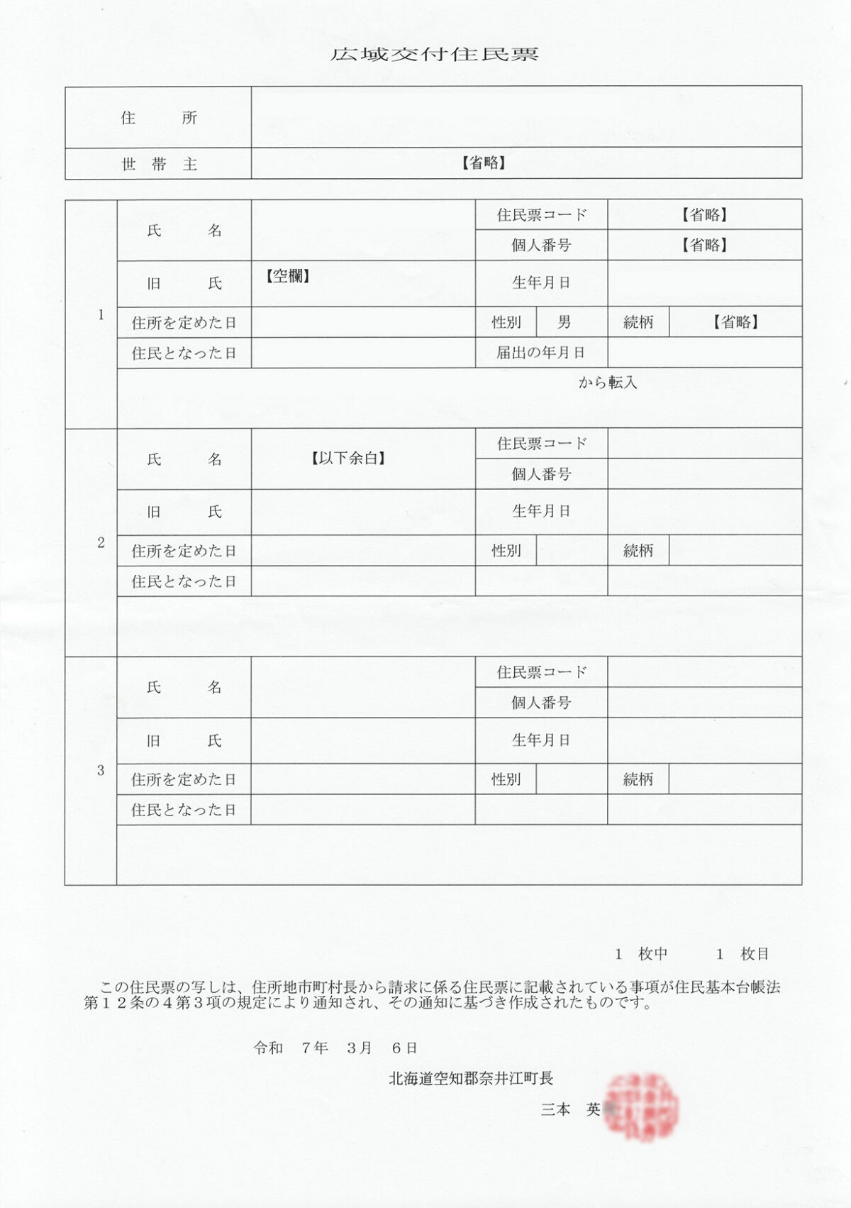 北海道 空知郡奈井江町 交付日 2025年3月6日 交付者 北海道空知郡奈井江町長 交付箇所 奈井江町役場 用紙 コピー用紙 公印 朱肉印 交付手数料 200円 公印の特徴 書体:隷書 文字配列:横書き3段+1段