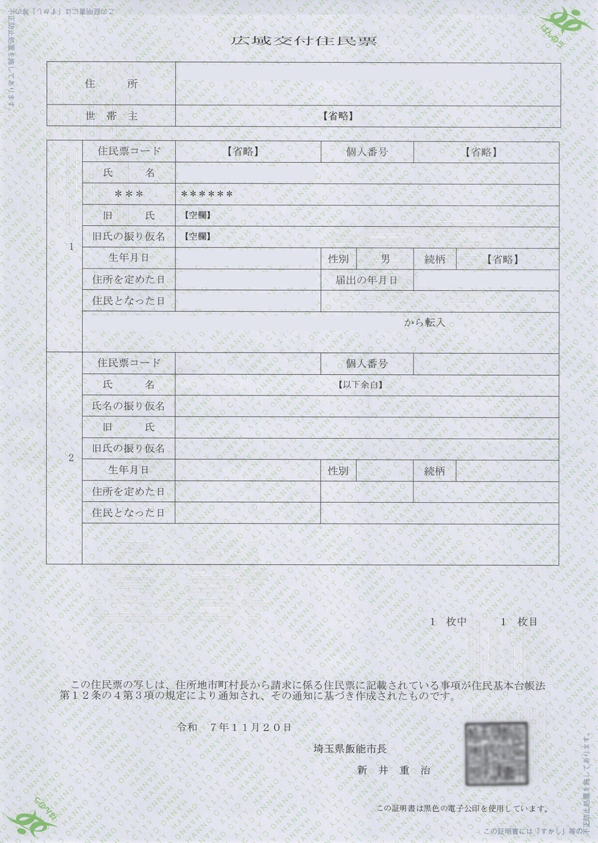 埼玉県 飯能市 交付日 2025年11月20日 交付者 埼玉県飯能市長 交付箇所 飯能市役所 用紙 改ざん防止用紙 公印 電子公印 交付手数料 200円 キャッシュレス対応 対応 キャッシュレスURL リンク 公印の特徴 書体:篆書 文字配列:横書き2段+1段 改ざん防止用紙の特徴 灰色背景に黄緑色で「HANNO CITY」の文字 右上と左下に市章