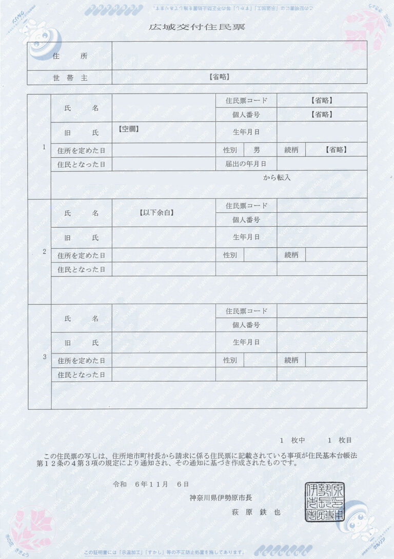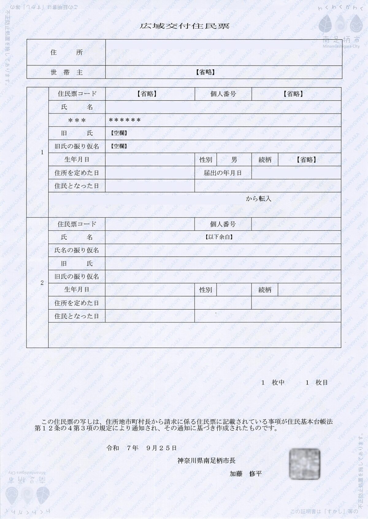 神奈川県 南足柄市 交付日 2025年9月25日 交付者 神奈川県南足柄市長 交付箇所 南足柄市役所 用紙 改ざん防止用紙 公印 電子公印 交付手数料 300円 キャッシュレス対応 対応 公印の特徴 書体:篆書 文字配列:横書き3段 改ざん防止用紙の特徴 薄青色背景に青色で「MINAMIASIGARA」の文字 右上と左下に市のロゴ