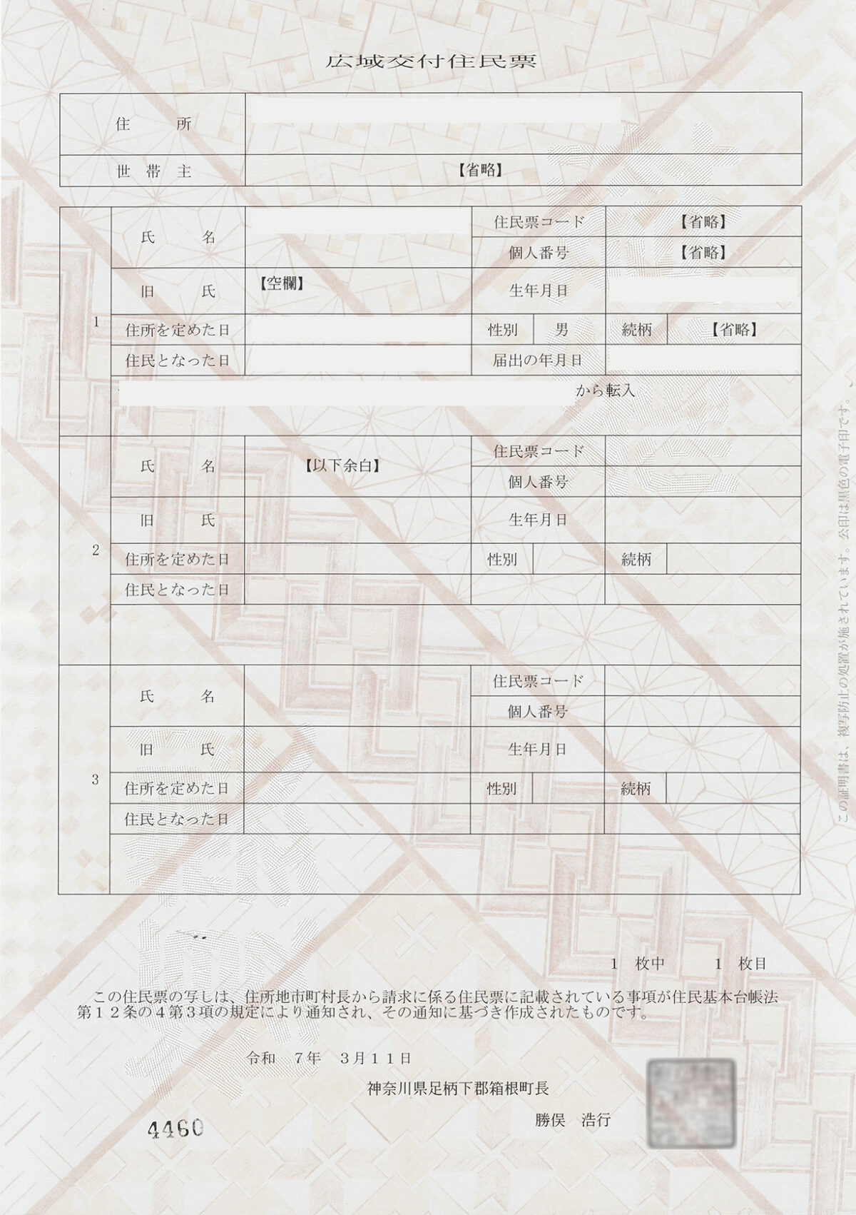 神奈川県 足柄下郡箱根町 交付日 2025年3月11日 交付者 神奈川県足柄下郡箱根町長 交付箇所 箱根町役場 用紙 改ざん防止用紙 公印 電子公印 交付手数料 300円 公印の特徴 書体:篆書 文字配列:横書き1+3段 改ざん防止用紙の特徴 箱根寄木細工をモチーフにした図案 備考 交付手数料の納付は、交付決定後に会計課窓口にて行う。 ▲納入通知書(兼)領収書