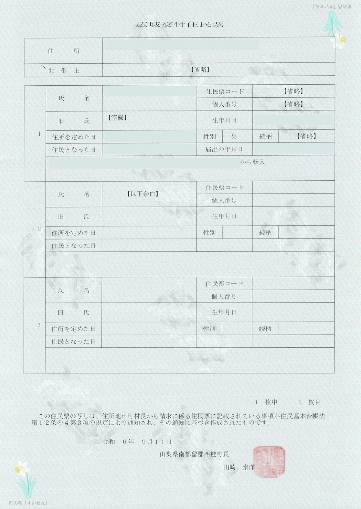 山梨県 南都留郡西桂町 交付日 2024年9月11日 交付者 南都留郡西桂町長 交付箇所 西桂町役場 用紙 改ざん防止用紙 公印 朱肉印 交付手数料 300円 公印の特徴 書体:篆書 文字配列:横書き2段+1段 改ざん防止用紙の特徴 白色背景に水色で「NISHIKATSURA」の地紋様 右上と左下に町の花「すいせん」
