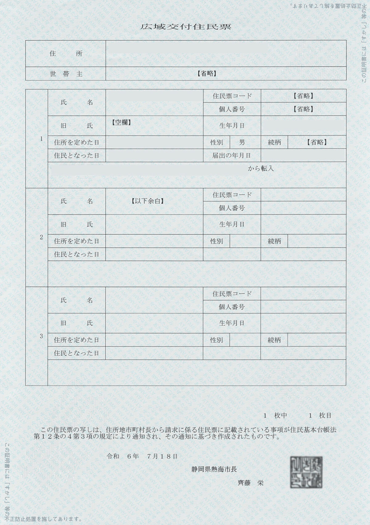 静岡県 熱海市 交付日 2024年7月18日 交付者 静岡県熱海市長 交付箇所 熱海市役所 用紙 改ざん防止用紙 公印 電子公印 交付手数料 300円 公印の特徴 書体:篆書 文字配列:縦書き3段 改ざん防止用紙の特徴 水色の背景に「あたみATAMI」の文字