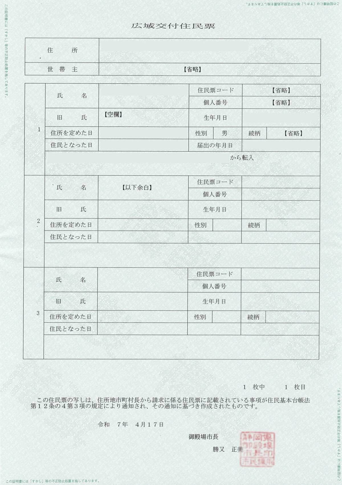 静岡県 御殿場市 交付日 2025年4月17日 交付者 御殿場市長 交付箇所 御殿場市役所 用紙 改ざん防止用紙 公印 朱肉印 交付手数料 300円 キャッシュレス対応 対応 キャッシュレスURL リンク 公印の特徴 書体:隷書 文字配列:横書き3+1段 改ざん防止用紙の特徴 緑色背景に白抜きで「ごてんば」の文字