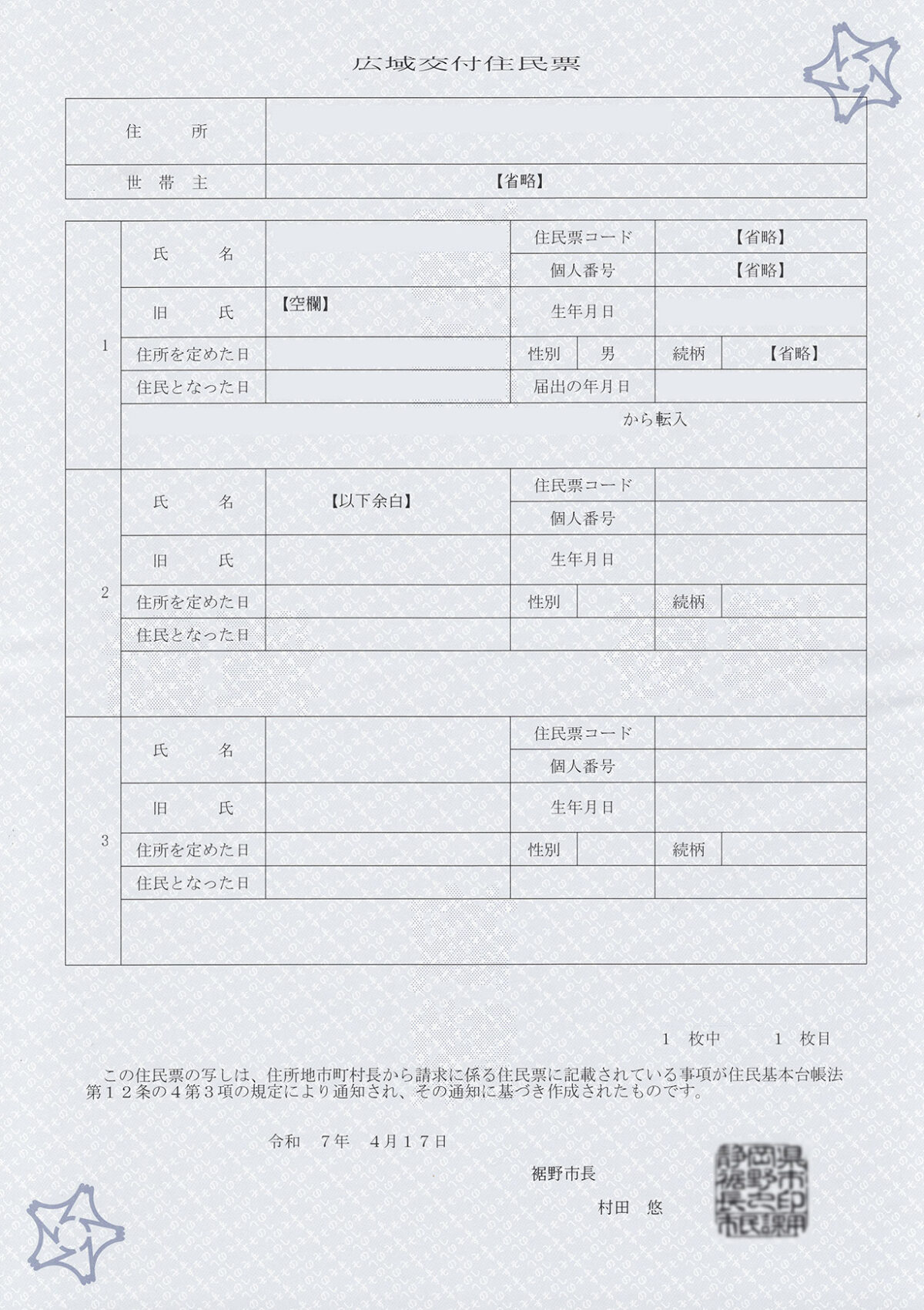 静岡県 裾野市 交付日 2025年4月17日 交付者 裾野市長 交付箇所 裾野市役所 用紙 改ざん防止用紙 公印 電子公印 交付手数料 300円 公印の特徴 書体:隷書 文字配列:横書き3+1段 改ざん防止用紙の特徴 紫色背景に白抜きで「すそのし」の文字 右上と左下に市章