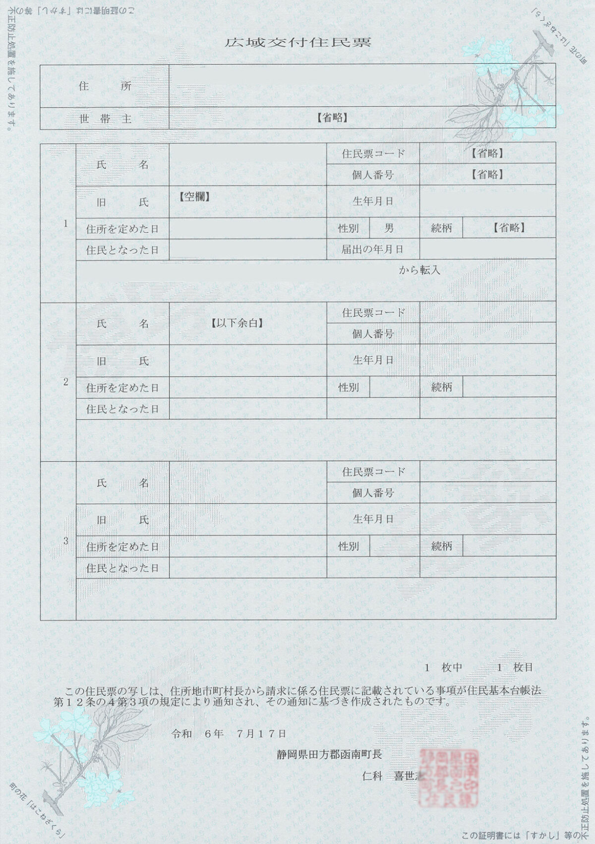 静岡県 田方郡函南町 交付日 2024年7月17日 交付者 静岡県田方郡函南町長 交付箇所 函南町役場 用紙 改ざん防止用紙 公印 朱肉印 交付手数料 300円 キャッシュレス対応 対応 キャッシュレスURL リンク 公印の特徴 書体:古印体 文字配列:横書き3段+1段 改ざん防止用紙の特徴 水色の背景に「かんなみ」の文字 右上と左下に町の花「はこねざくら」