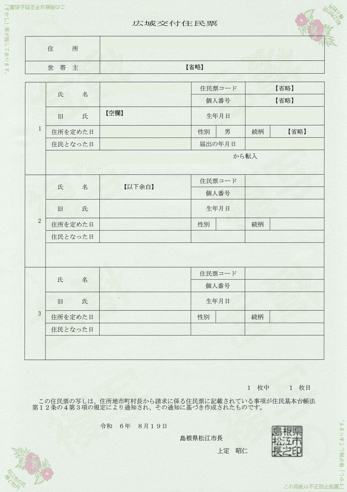島根県 松江市 交付日 2024年8月19日 交付者 島根県松江市長 交付箇所 松江市役所 用紙 改ざん防止用紙 公印 電子公印 交付手数料 300円 キャッシュレス対応 対応 キャッシュレスURL リンク 公印の特徴 書体:古印体 文字配列:横書き3段 改ざん防止用紙の特徴 薄緑色の背景 右上と左下に松江市の花「椿と牡丹」