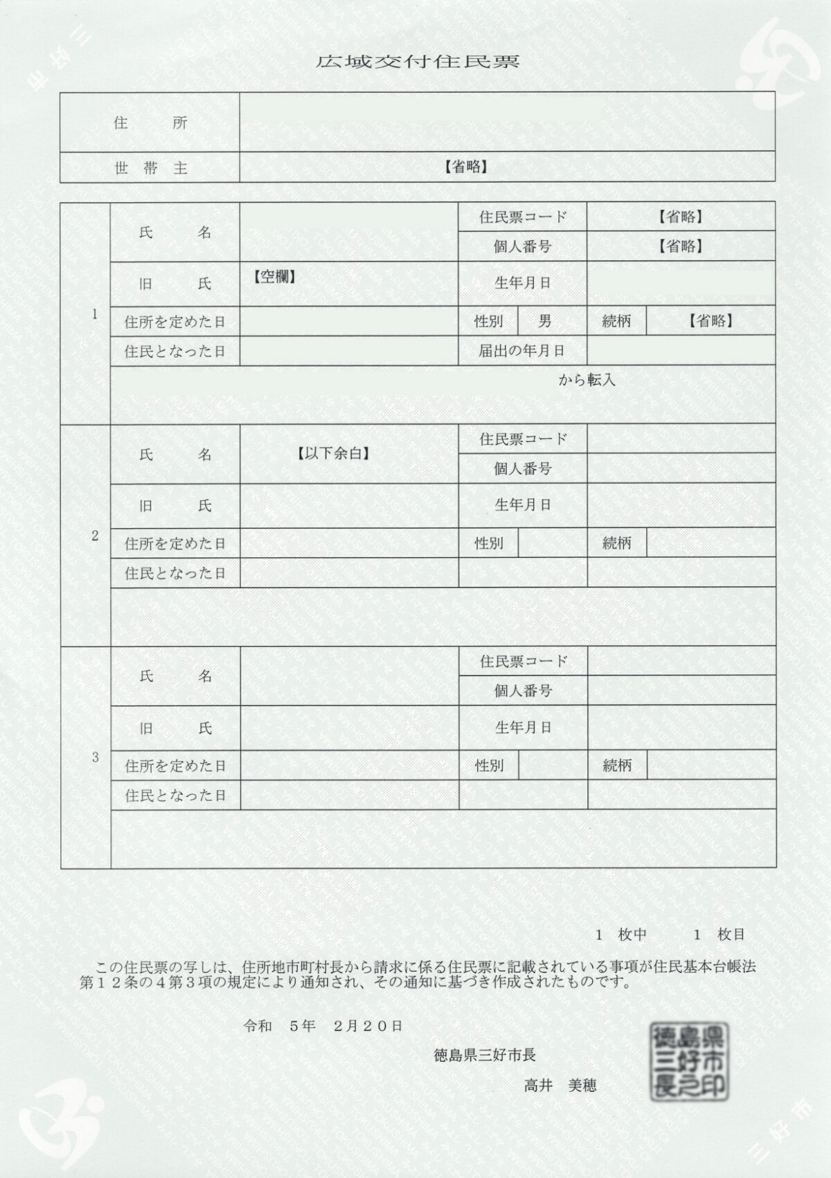 徳島県 三好市 交付日 2023年2月20日 交付者 徳島県三好市長 交付箇所 三好市役所 用紙 改ざん防止用紙 公印 電子公印 交付手数料 300円 公印の特徴 書体:古印体 文字配列:横書き3段 改ざん防止用紙の特徴 薄緑色の背景に「TOKUSHIMA みよし」の文字 左上と右下に「三好市」の文字 右上と左下に市章