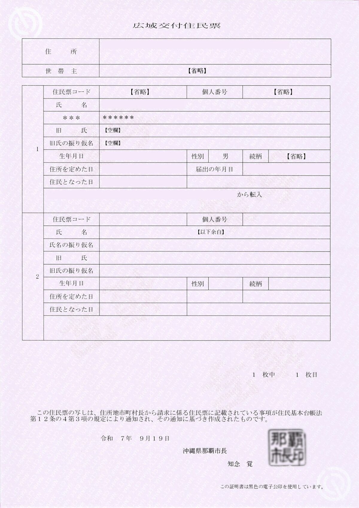 沖縄県 那覇市 交付日 2025年9月19日 交付者 沖縄県那覇市長 交付箇所 那覇市役所 用紙 改ざん防止用紙 公印 電子公印 交付手数料 300円 キャッシュレス対応 対応 キャッシュレスURL リンク 公印の特徴 書体:隷書 文字配列:横書き2段 改ざん防止用紙の特徴 薄赤色背景に白抜きで「NAHA CITY」の文字 左上と右下に市章