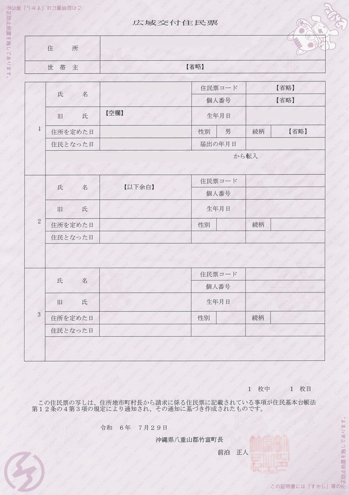 沖縄県 八重山郡竹富町 交付日 2024年7月29日 交付者 沖縄県八重山郡竹富町長 交付箇所 竹富町役場 用紙 改ざん防止用紙 公印 電子公印 交付手数料 300円 公印の特徴 書体:篆書 文字配列:縦書き2段 改ざん防止用紙の特徴 薄赤色の背景に「TAKETAOMI TOWN」の文字 右上に何らかのキャラクタ 左下に町章